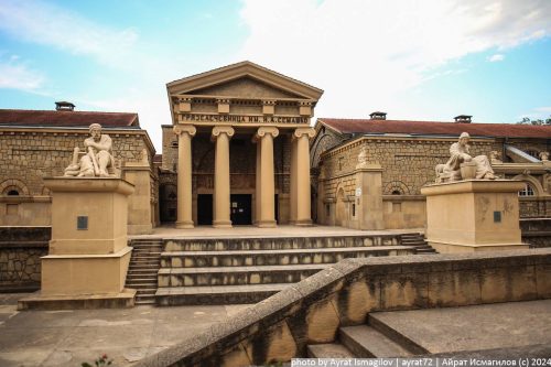 Одно из самых красивых и знаковых лечебных зданий города, построено в 1915 году в стиле, напоминающем римские бани, с ионическими колоннами, скульптурами львов, богами исцеления и чистоты ― Асклепий и Гигиея.